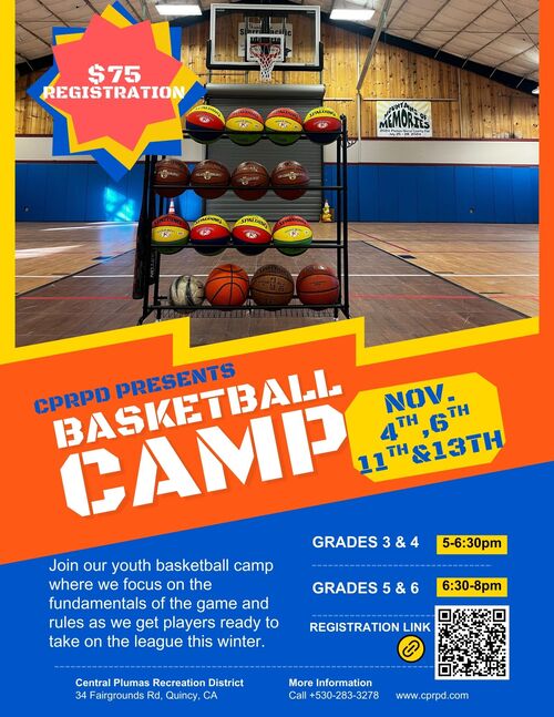 CPRPD is happy to announce the arrival of Youth Basketball Camp. Developed for players moving up in the league, this camp will focus on basketball fundamentals and basic gameplay. Daily games and drills will improve the skillset of any participant and get them ready for the upcoming youth basketball draft and Feather River League coming in December. Registration is available to boys and girls grades 3rd - 6th for $75 per player.