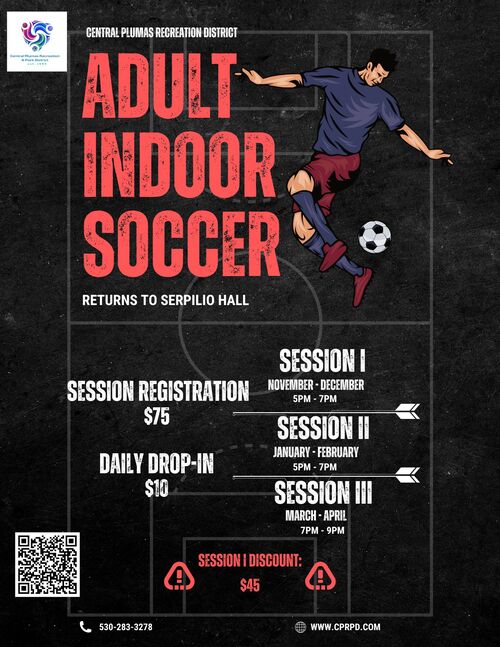 Adult Indoor Soccer returns to Serpilio beginning in November. Pick up games will form every Tuesday and Thursday night from 5-7pm in Serpilio Hall at the Plumas-Sierra County Fairgrounds.